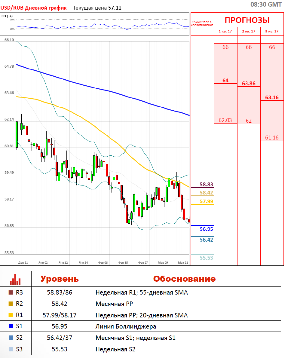 Вчерашнюю торговую сессию валютная пара USD/RUB завершила в красной зоне около отметки 57.26, где российский рубль незначительно вырос по отношению к доллару США, а именно на 0.07%. На момент публикации данного материала, торги по паре проходят вновь в красной зоне около отметки 57.08, где пара стремится к нижней линии Боллинджера на 56.95, в случае пробоя которой, USD/RUB будет нацелена на уровни сопротивления— месячную и недельную S1 на 56.42/37. Сегодня цены на нефть немного растут, в связи с чем российская валюта укрепляется.