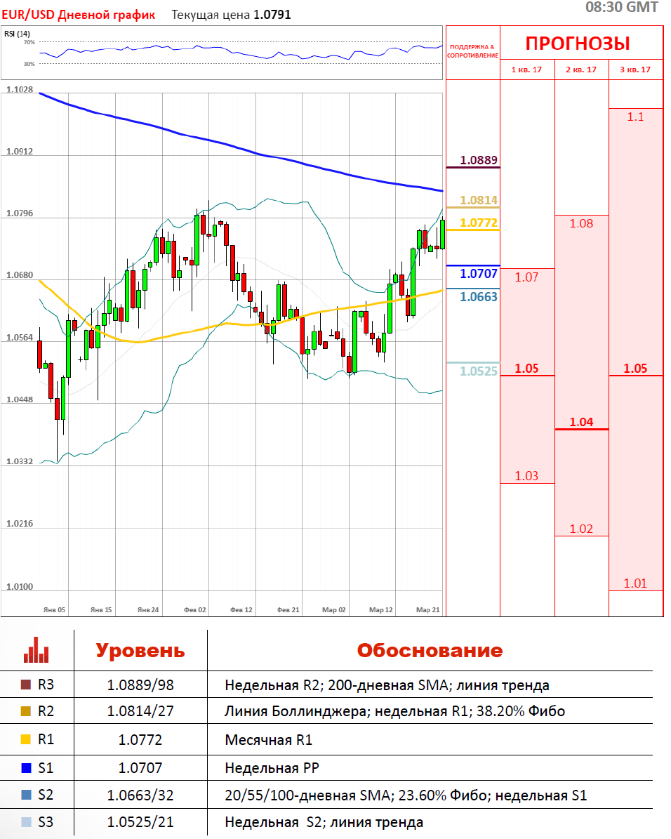 20 марта торги по паре EUR/USD завершились небольшим ростом европейской валюты к доллару США на 9 пунктов, в то время как волатильность составила 52 пункта. Сегодня пара торгуется в зелёной зоне около отметки 1.0799, где с утра преодолела месячную R1 на 1.0772. Локальным уровнем поддержки для EUR/USD на данный момент служит недельная РР на 1.0706. В свою очередь, уровнем сопротивления для валютной пары является недельная R1 на 1.0813, в случае пробоя которой, вероятно усиление бычьих настроений по EUR/USD.