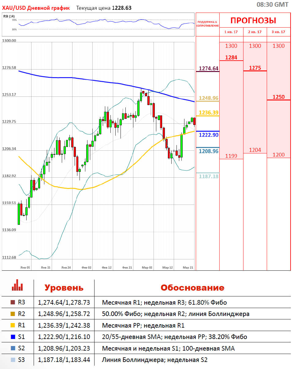 По паре XAU/USD 4 торговые сессии подряд мы наблюдали восходящую динамику, так и вчера торги завершились укреплением золота против американского доллара на 0.36%, однако пара так и не смогла преодолеть месячную точку разворота на 1,236. Во вторник пара XAU/USD развернулась и на данный момент торгуется около отметки 1,228 в красной зоне, где стремится к локальному уровню сопротивления, а именно 20-дневной SMA на 1,222. Уровнем поддержки для пары сегодня является месячная РР.