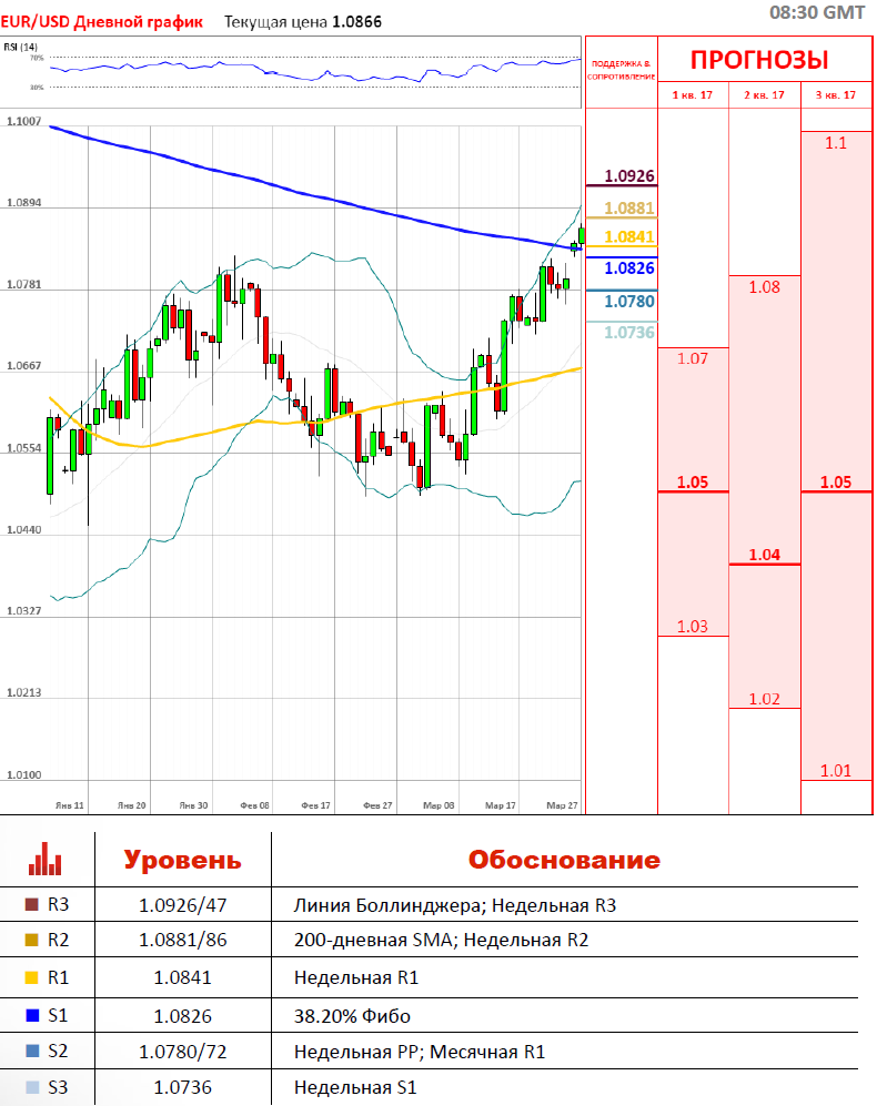 Евро открыл неделю впечатляющим ростом по отношению к доллару. Закрыв пятничные торги на отметке 1.0797, сегодняшние торги пара EUR/USD открыла близ отметки 1.0835. На момент публикации, торги по паре проходят в районе 1.0854. Похоже на то, что пара намерена достичь уровня 1.0880. Однако, по достижению данного уровня, бычьи настроения по паре скорее всего ослабеют, так как на пути пары встанет 200-дневная SMA, расположившаяся на отметке 1.0881, за которым на отметке 1.0886 расположилась недельная R2. Настроение трейдеров