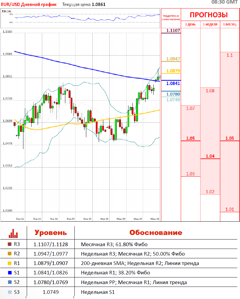 Завершив две торговых серии в зелёной зоне, евро не удалось продолжить рост по отношению к доллару во вторник, 28 марта. Пара EUR/USD открыла сегодняшние торги на отметке 1.0864 и после непродолжительных попыток удержаться на плаву пошла вниз, на текущий момент торгуясь в районе 1.0852. Судя по всему, пара продолжит движение в данном направлении до недельной R1, выступающей поддержкой. Однако, если индекс потребительской уверенности в США выйдет выше, чем ожидалось, пара продолжит своё падение до 38.20% Фибо.