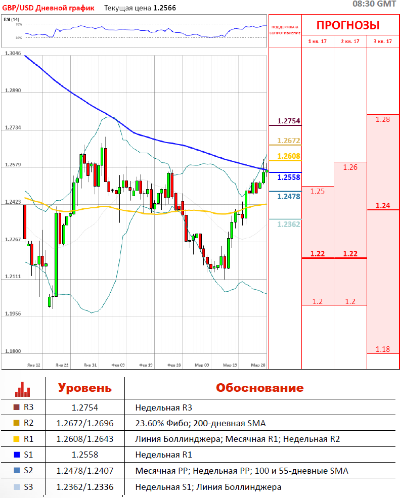 Паре GBP/USD удалось продолжить восходящее движение во вторник. Провал реформы здравоохранения Трампа позволил фунту воспользоваться слабостью доллара и приблизиться к месячной R1, выступающей уровневнем сопротивления. Однако, велика возможность того, что настроения все же могут смениться и паре не удастся достичь отметки 1.2610 после выхода индекса уверенности потребителей. В случае выхода лучших, чем ожидается значений, пара развернётся вниз и встретит поддержку на отметке 1.2558.