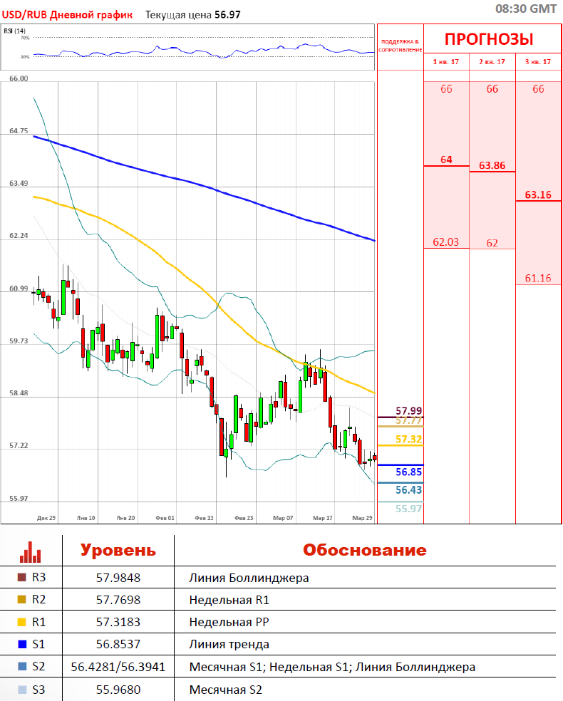 Нефть немного дорожает в ходе торгов 29 марта, укрепляя курс рубля. Не смотря на то, что пара выросла после официального закрытия торгов во вторник, она сдала свои позиции уже в течение первых часов сегодняшних торгов. На момент публикации материала, пара торгует в районе 56.9807. Ожидается, что пара продолжит торги в этом районе до выхода данных по запасам нефти в США. Если данные выйдут на ожидаемом уровне, может произойти разворот вверх и пара продолжит рост вплоть до недельной PP, выступающей уровнем сопротивления.