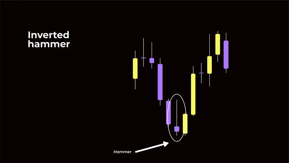 The inverted hammer appears at the end of a downtrend and looks like an upside-down hammer, with a small body at the bottom and a long upper wick. This pattern indicates that buyers tried to push the price higher during the session, but were unable to hold those gains. Despite this, it suggests that selling pressure may be weakening, hinting at a possible bullish reversal.
