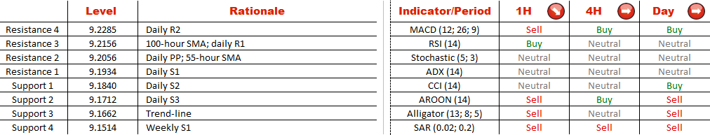 EUR/SEK is fluctuating under 9.19 on Monday, the lowest level since Thursday of the previous week. The common currency was unexpectedly derailed by the 100-hour SMA, which was shortly touched by the pair earlier today. Despite quite bullish (54%) SWFX market sentiment, the one-hour technical indicators are pointing to the south. A retreat below 9.18 should lead to a sell-off down to the pattern's lower boundary at 9.1662. If the bears fail to contain a decline here, then we will expect the weekly S1 (9.1514) to be tested later this week. In the meantime, the bulls are watching 9.24 (weekly PP), which can be reached in case of a jump above 100-hour SMA any time soon.