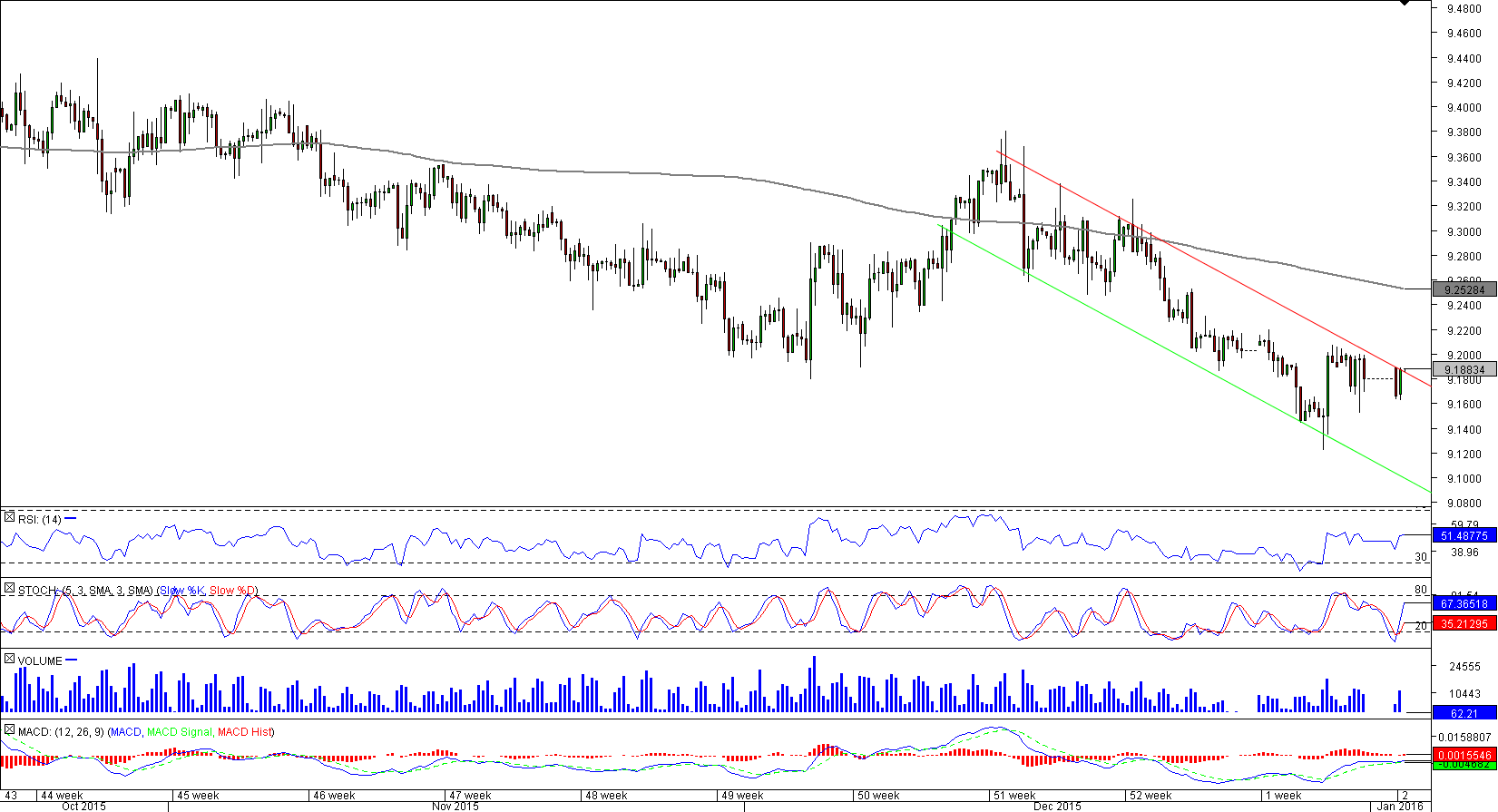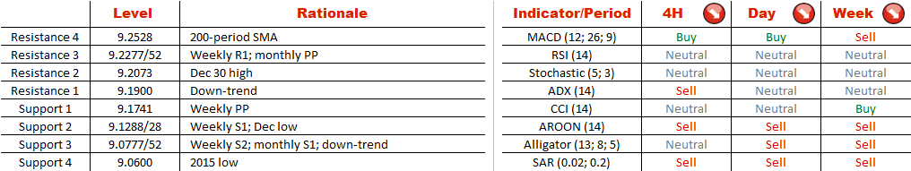 Our bias with respect to the Euro is negative. The currency has been in a down-trend since last year's August, and for the time being there seem to be no reasons to change the outlook. In addition, EUR/SEK has formed a high-quality bearish channel, and a majority of the technical indicators on all three relevant time-frames is pointing south. Accordingly, over the next few weeks the price should descend from 9.19 to the 2015 maximum at 9.06. In the meantime, a close above 9.19 will not imply a prolonged rally because of a number of strong resistances lying overhead, such as the December 30 high at 9.2070 and a combination of the weekly R1 and monthly PP at 9.2277/52.