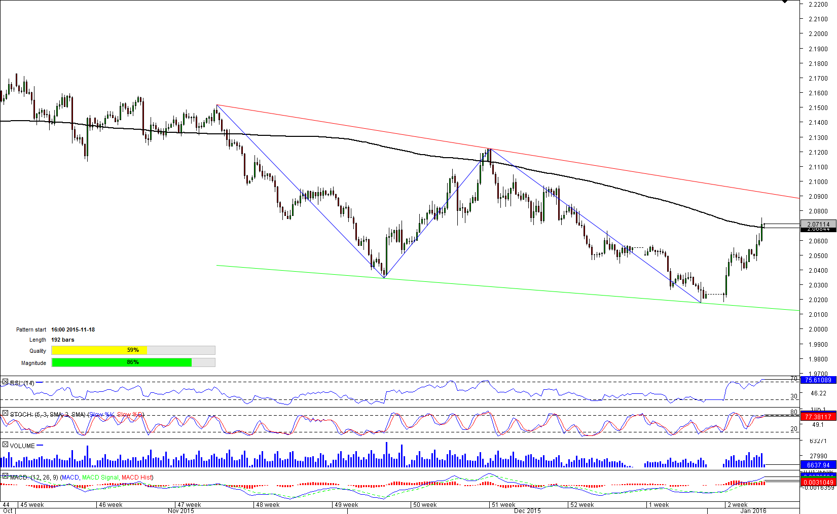 Since Monday the UK currency has been recovering against the Australian Dollar. For now the pair has also gone through more than four figures and violated several important resistances, such as the monthly pivot point and 100-period SMA. Hence, the bullish pressure tends to be quite confident. Near-term risks are created by the 200-period SMA and weekly R2 at 2.07 and 2.0719, respectively. Success here will imply a rally toward the next major supply at 2.09 (weekly R3, monthly R1 and pattern's upper edge), supported by 54% of SWFX market participants. Nevertheless, according to the weekly technical indicators, a continuous growth is not guaranteed in the long-term.
