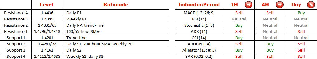 The Cable is unable to violate the red trend-line for a second time in two days. Despite that, this is a rare case when an ascending triangle formed a reversal pattern at the end of a downtrend. It indicates that some attempts to climb will be in place for some time, unless the bulls give up and allow the bears to take leadership over the cross. The latter idea is, however, supported by daily technical indicators. Bearish scenario is also fuelled by the fact that the pair seems to be overbought, as 64% of all SWFX trades are long. GBP/USD is going to meet a formidable support area at 1.4262/38. Only by closing below the weekly pivot point it will reopen much lower levels including Jan 26/21 lows at 1.4173/4082.