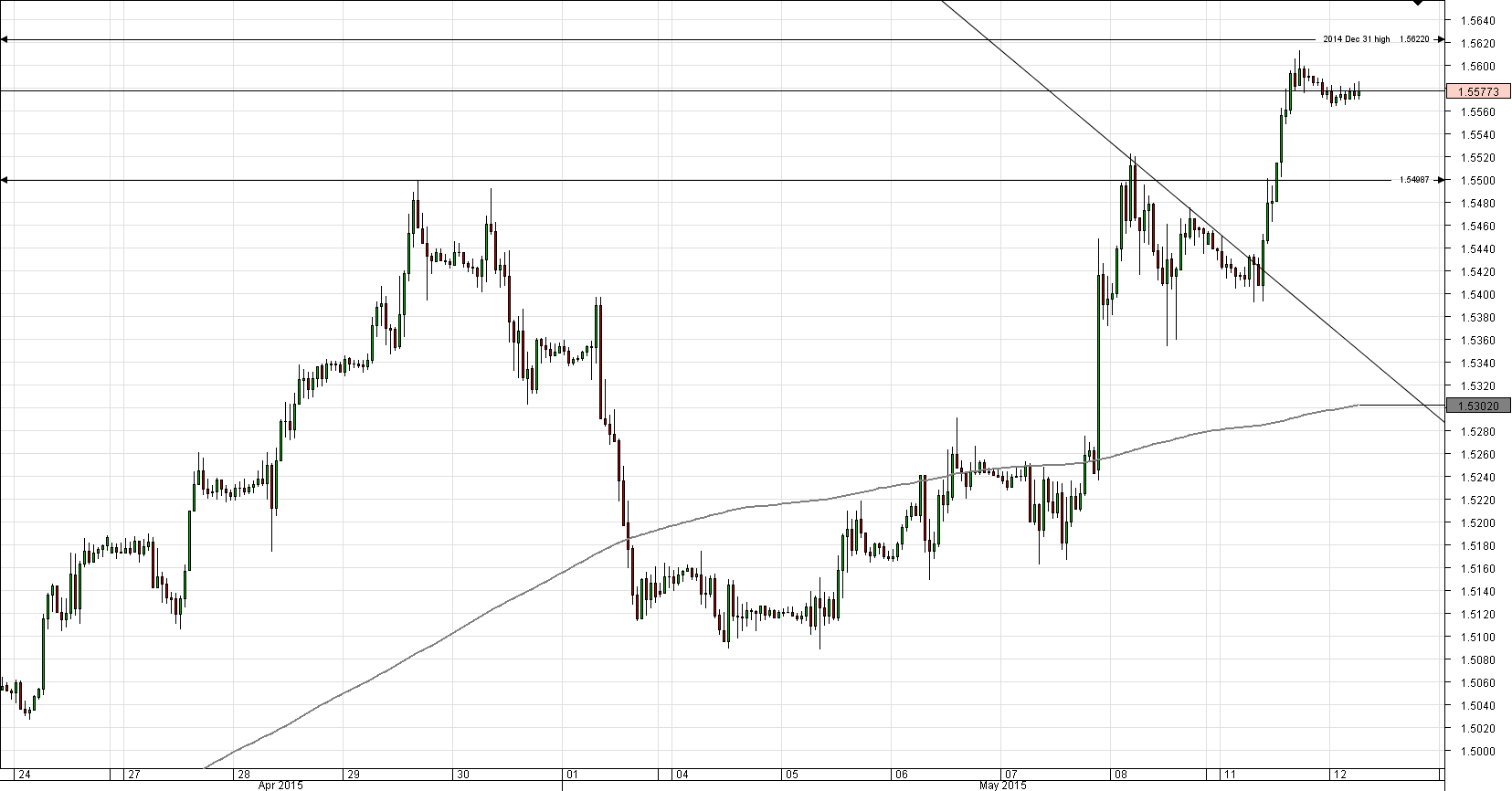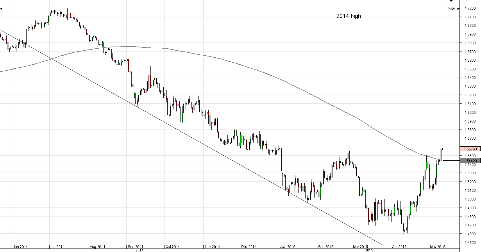 As was anticipated, Cable's downslide did not last, as the pair added 186 pips in the middle of the day. The April high was easily pierced, while the 1.56 psychological level was tested. The Sterling has been steadily appreciating against the US Dollar since the middle of April, with minor setbacks on the way. The next target is now the last year's December 31 high at 1.5622.