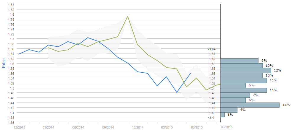 The mean forecast for August 12 is 1.5136, while the majority (58%) of survey participants expect the Sterling to cost more than 1.50 dollars in three months. The most popular price intervals is 1.42-1.44, chosen by 14% of the surveyed. The second most popular choice is taken by the 1.56-1.58 price interval, selected by 12% of the voters.