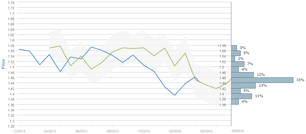 The majority of traders (66%) believe the British currency is to cost 1.44 or more dollars after a three-month period. The most popular price interval was selected by more than a quarter (33%) of the voters, namely the 1.44-1.46 one, while the second most popular choice implies that the Sterling is to cost between 1.42 and 1.44 dollars in three months, chosen by 13% of the surveyed. At the same time, the mean forecast for Aug 12 is 1.4543.