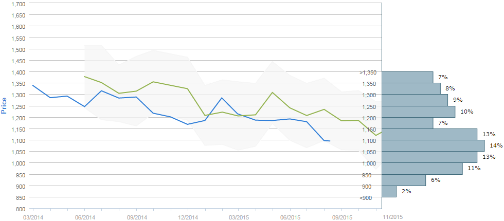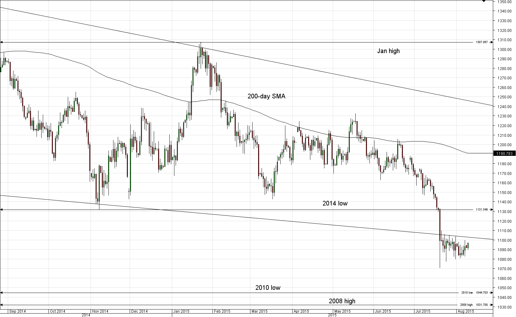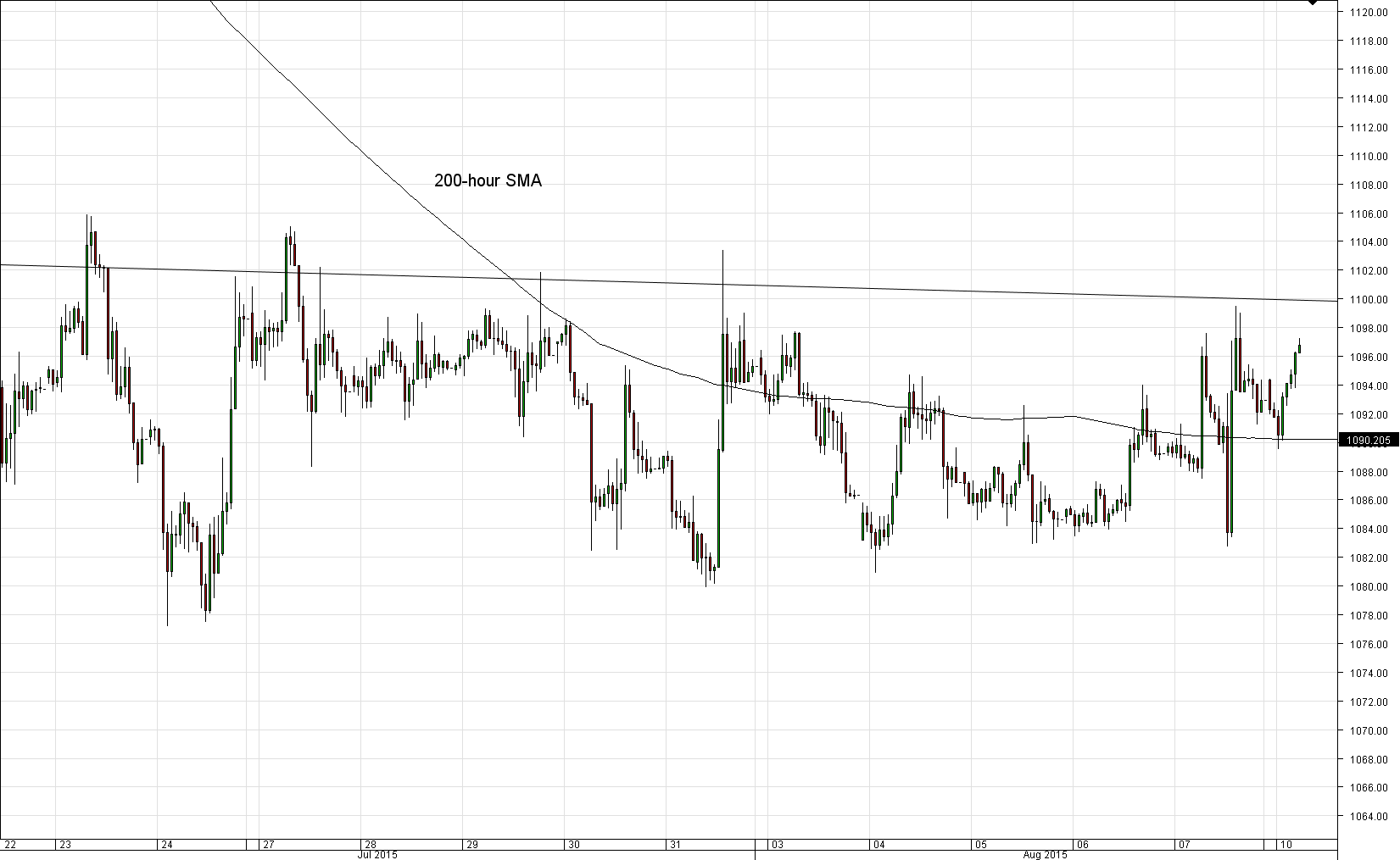 In the one-hour chart the bullion's no-change trading is more visible at the moment. The future scenario is biased in favour of bears, as they may receive some extra momentum from either the 200-hour SMA, currently at 1,090 or local highs around 1,100.