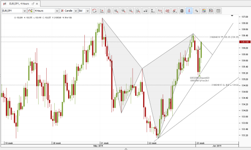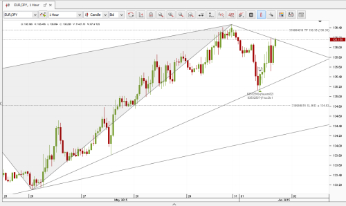 this is eur jpy on 1H time Frame . as we can see here there is uprising trend focused on two points . and a triangle that price moving between it's sides . we can see in this price action that price will raise above the highest side of the triangle . then there is a strong resistant level in 136.50 .. so we can wait until the price reach this area then we could go on short order .