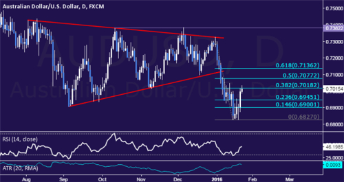 Near-term resistance is at 0.7018, the 38.2% Fibonacci retracement, with a break above that on a daily closing basis opening the door for a test of the 50% level at 0.7077. Alternatively, a reversal below the 23.6% Fib at 0.6945 paves the way for a challenge of the 14.6% retracement at 0.6900.