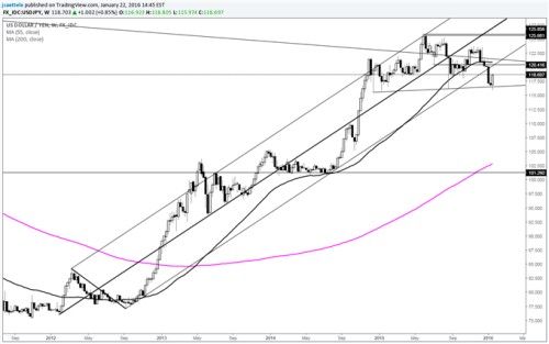 -The most recent FXTW note was “the uptrend that USD/JPY enjoyed since the December 2012 breakout is over. The cross topped nearly 7 months ago at a long term trendline. All of this doesn’t mean that USD/JPY can’t or won’t experience rallies. All of this does mean that rallies should be sold. Be patient and use stops, as outlined in the popular TOST series. As noted in the Q1 technical outlook, a head and shoulders pattern yields a target near 105.” We got a rally! In fact, the rally materialized following a test of the neckline from a year-long head and shoulders pattern. Watch former support (lower parallel from previously bullish market and 55 week average) for resistance.