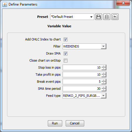 After setting the parameter values choose Run to start the strategy.
