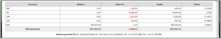 The intraday statement dispatches the intraday activity per instrument. The statement provides chronologically the transactional activity, the current exposure and the profit and loss per instrument, and at the account level, every profit and loss being reported and converted with market prices when there is profit and loss in a currency other than the account base currency. Cash flows are also reported when they are booked. As the intraday statement does not include commissions, the statement is purely trading oriented.
